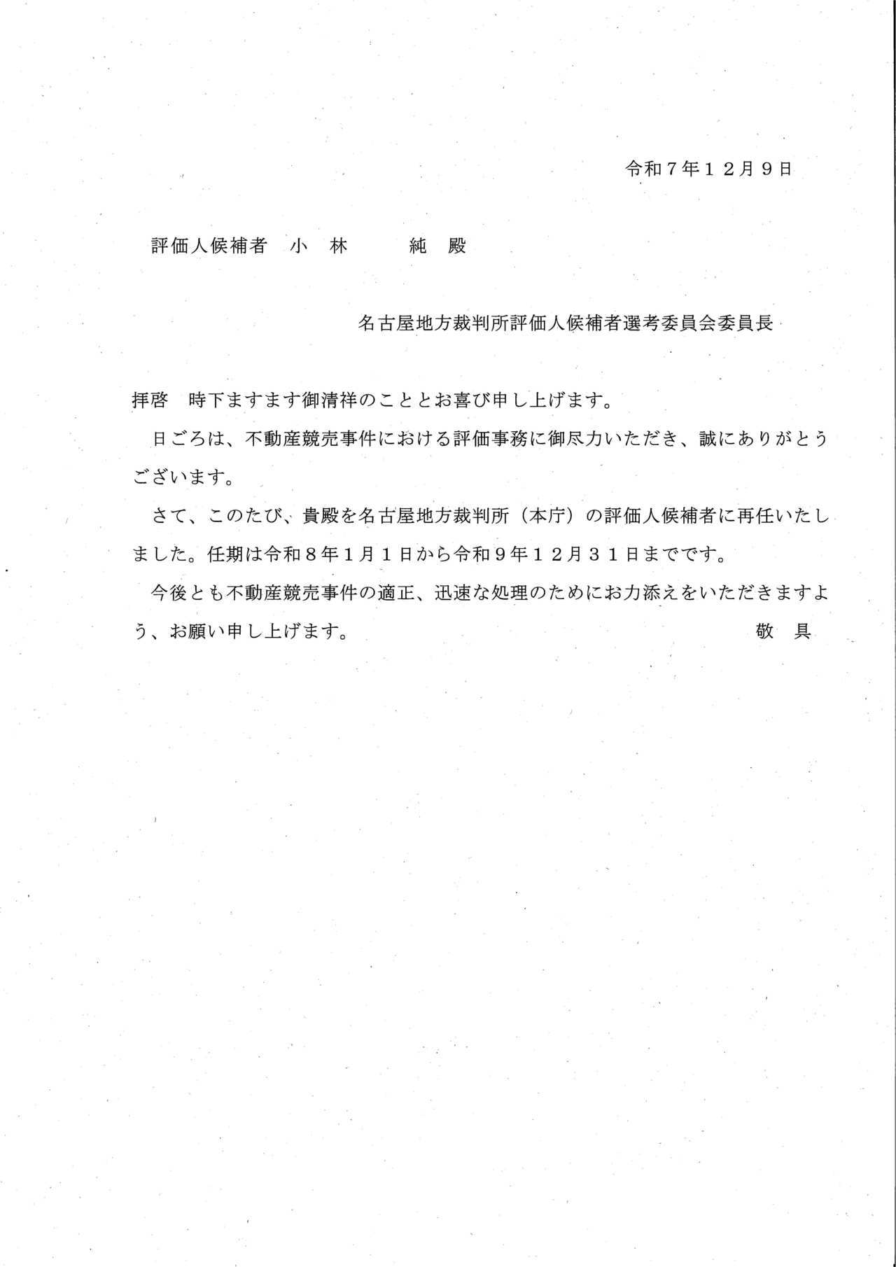 競売評価人の再任通知書